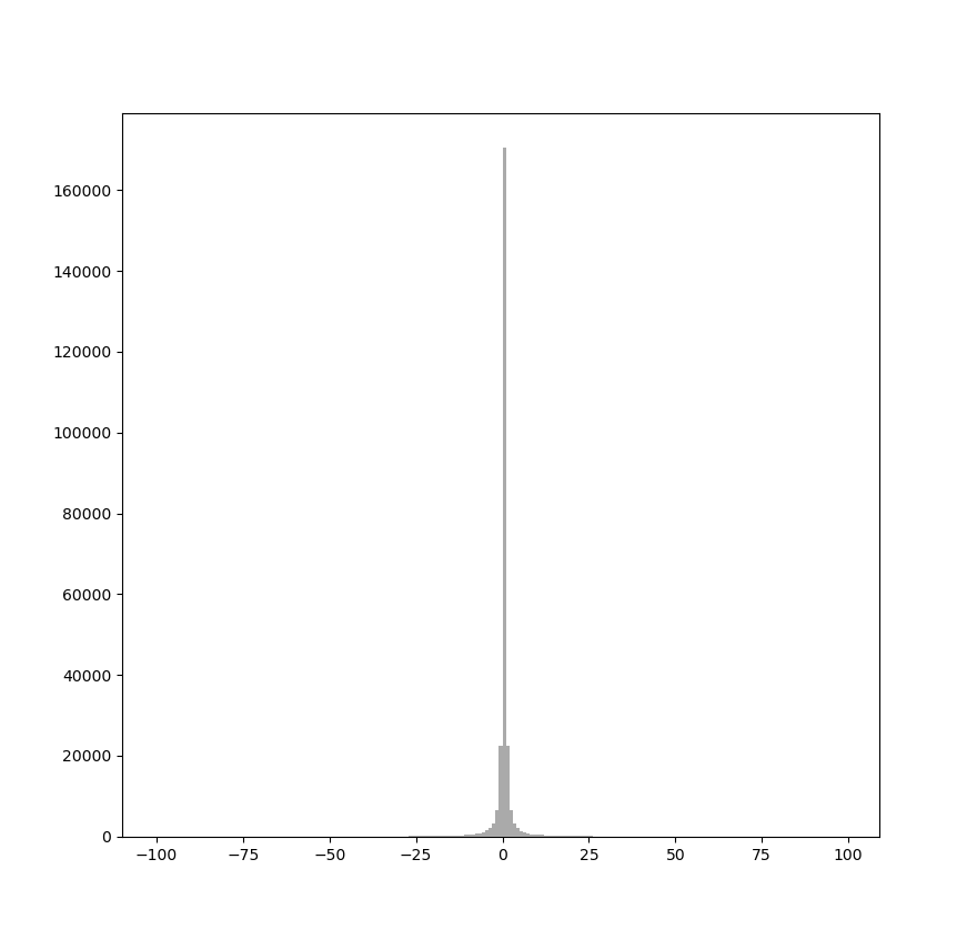 En la figura 1 se puede observar la simetría que se produce en el histograma DCT en una imagen JPEG de ejemplo. En el histograma completo de la figura 1a podemos ver que la barra que representa el número de coeficientes de valor 0 es extremadamente alta. En el histograma ampliado de la figura 1b podemos ver de manera más clara la simetría que se produce entre ambos lados del histograma: la barra que representa el número de coeficientes con valor $1$ tiene una altura similar a la de coeficientes con valor $-1$, la que representa coeficientes con valor $2$ tiene una altura similar a la de coeficientes con valor $-2$, etc.